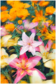 Colorful lilies and marigolds in a vibrant garden setting, showcasing nature's beauty.