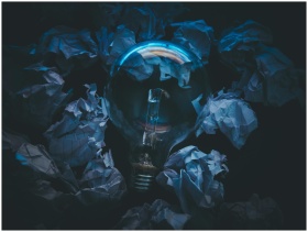 A light bulb surrounded by crumpled paper symboliz