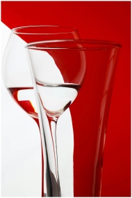 Close-up of crystal wine glasses with a red backgr