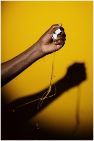 Close-up of a hand squeezing an egg with shadow against a bold yellow background.