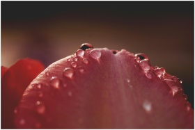 Macro photograph capturing dewdrops on a vibrant r