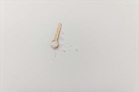 A wooden spoon with salt on a white background, offering ample copyspace.