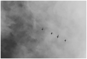 A striking minimalist black and white photo of birds flying through moody clouds.