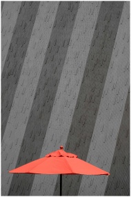Bold red umbrella contrasts sharply with a geometr