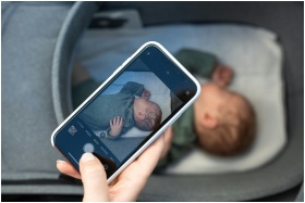 A smartphone capturing a peaceful newborn baby sleeping in a crib, highlighting modern parenthood.