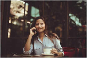 Young woman in casual shirt talking on phone and holding coffee at an outdoor café table.