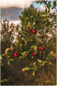 Vibrant red apples hanging on a tree in a serene autumn setting, perfect for nature themes.