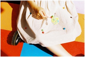 A person holding a lollipop with candies on a colorful surface. Fun and playful vibe.