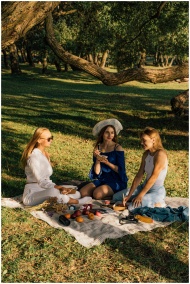 Three women enjoying a picnic outdoors in a sunny park, surrounded by lush trees.