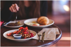 Enjoy a delicious brunch featuring waffles topped