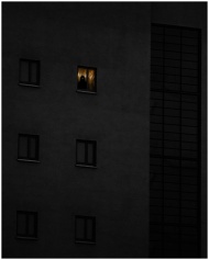 Eerie building facade in Augsburg with illuminated window at night creates a mysterious atmosphere.