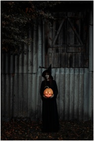 A witch in costume holding a carved pumpkin under