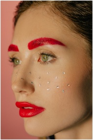 Close-up portrait of a woman with bold red makeup and glitter accents on her face.