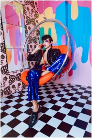 A stylish person poses in a retro-themed room with bold colors and patterns, wearing a sequined outfit.