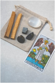 Top view of tarot card and healing stones on a can
