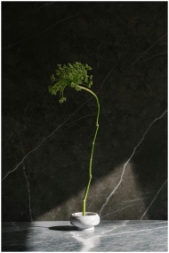 A single green stem in a vase on a marble surface, creating a minimalist still life artwork.