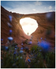 A lone figure stands silhouetted under a beautiful natural canyon arch at sunset.