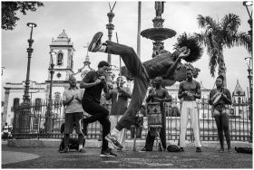 Energetic capoeira dancers showcase their skills in a lively street performance in Salvador's historic Pelourinho district.