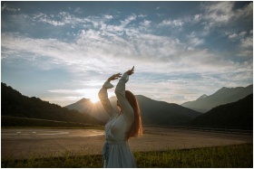 A woman gracefully dances with arms raised, set against a mountain sunset backdrop.