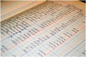 Close-up of a vintage handwritten ledger detailing financial records and accounts.