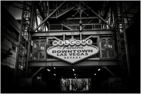 Iconic 'Welcome to Fabulous Downtown Las Vegas' sign in black and white.