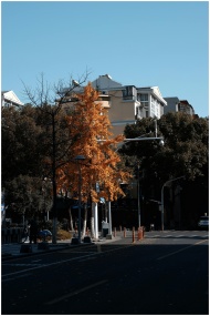 Urban scene with autumn leaves, highlighting city architecture under clear blue sky.