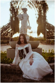 A woman in Victorian attire sits by a stone statue in a garden at sunset, embodying elegance.
