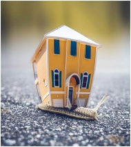 A surreal image of a house riding on a snail, blending architecture and nature in a whimsical scene.