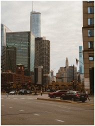 Street-level view of Chicago's iconic downtown skyscrapers with people and cars, showcasing urban life.