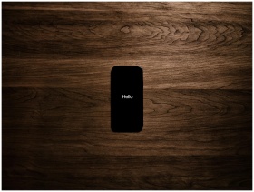 A smartphone displays 'Hello' against a dark wooden background, offering a sleek tech aesthetic.