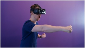 Caucasian man immersed in virtual reality using VR headset, making a punching gesture against a purple backdrop.