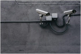 Two surveillance cameras mounted on a concrete wall, highlighting security technology.