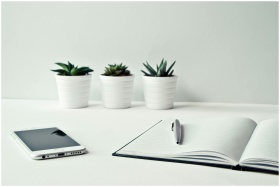 A clean, minimalist workspace featuring a smartphone, open notepad, pen, and potted succulents.