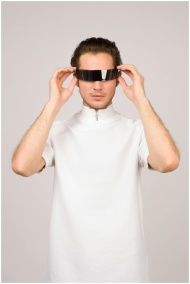 A young man in a stylish white shirt poses with futuristic VR glasses, embodying modern tech fashion.