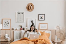 Young woman in cozy bedroom using a laptop, surrou