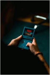 Close-up of individual holding a retro handheld ga