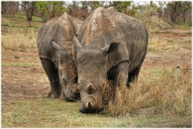 Two rhinoceroses grazing in a natural wildlife reserve, showcasing conservation efforts.