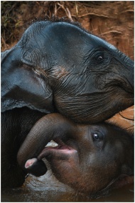 A touching moment of Asiatic elephants enjoying th