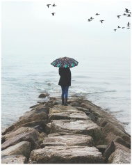 A solitary figure under an umbrella stands on a rocky path by the sea, with birds flying overhead.