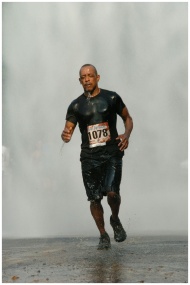 Man participating in a marathon running through a waterfall, wearing black outfit with bib number 1078.