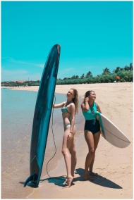 Two women with surfboards enjoying a sunny beach day, embodying a healthy lifestyle.