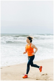 Caucasian woman jogging on the beach in orange tan