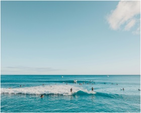 Enjoy surfers riding the waves under a clear sky in Hawaii's ocean paradise.