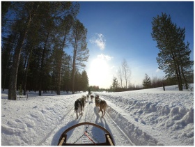 Experience a thrilling dog sled journey through the snowy landscapes of Rovaniemi, Finland.