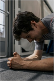 A man performs a plank exercise indoors, showcasing concentration and fitness motivation.
