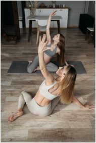 Two women in yoga attire practicing poses indoors, showcasing flexibility and mindfulness.