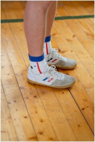 A close-up view of legs wearing colorful socks and sports shoes on a wooden indoor floor.
