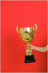 Close-up of a hand holding a gold trophy against a bold red background.