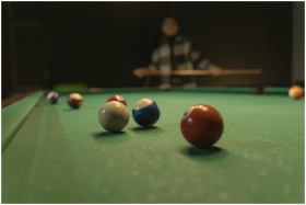 A vibrant shot of a billiards table with focused cue balls, capturing a player in the background.