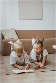 Siblings lying on the floor, doing homework togeth